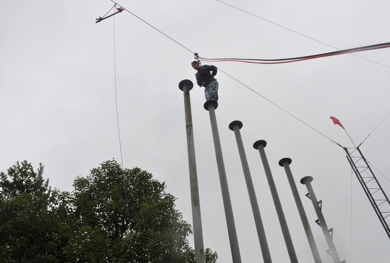 “云中漫步”是本次訓練最為驚心動魄的一個項目,站在將近十米的鐵桿之端,年青氣盛、身體矯健的男隊員都是戰(zhàn)戰(zhàn)兢兢,膽子小的隊員以及女隊員更是充滿恐懼,甚至有的隊員堅決表態(tài)不要參與該項目。隊員小江自告奮勇,第一個完成了任務(wù),給本項目開了先河,緊接著女隊員小羅在全體隊員的真誠鼓勵下,第二個完成了任務(wù),更是給大家?guī)砹四蟮墓奈韬陀職?。之后所有隊員相繼沖上了高桿,雖然有的膽小女隊員幾乎在桿子上哭泣掉淚,但是最終還是勇敢的邁出了腳步,全部隊員勝利完成項目任務(wù)。這個過程,讓大家克服了心理障礙,突破了自我極限,真正體會到“空中一小步,人生一大步”的真諦。