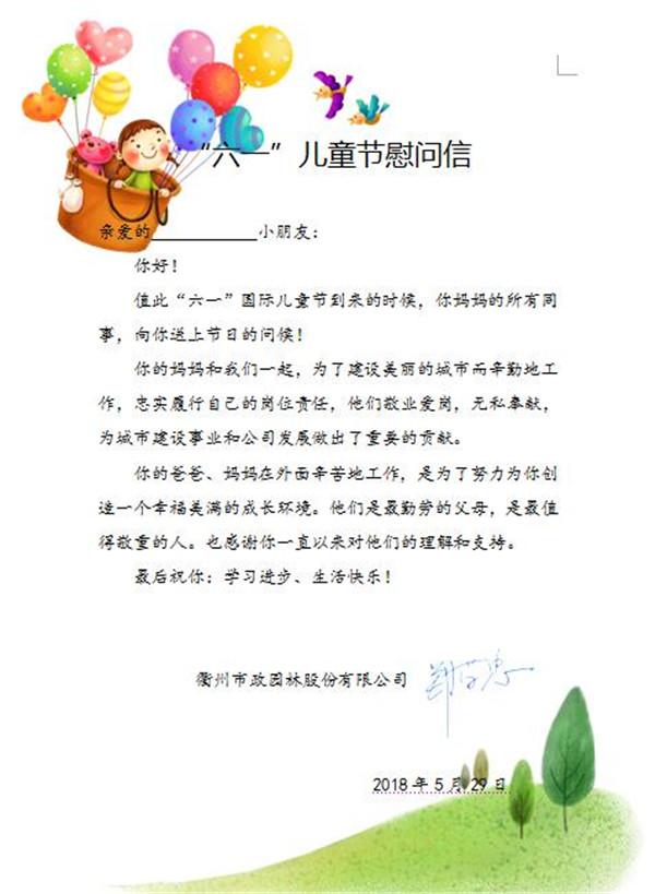 在節(jié)日來臨之際,我司給每位員工子女送去了由董事長親自簽名的慰問信,代表公司傳達(dá)了對(duì)員工子女的關(guān)心和祝福。