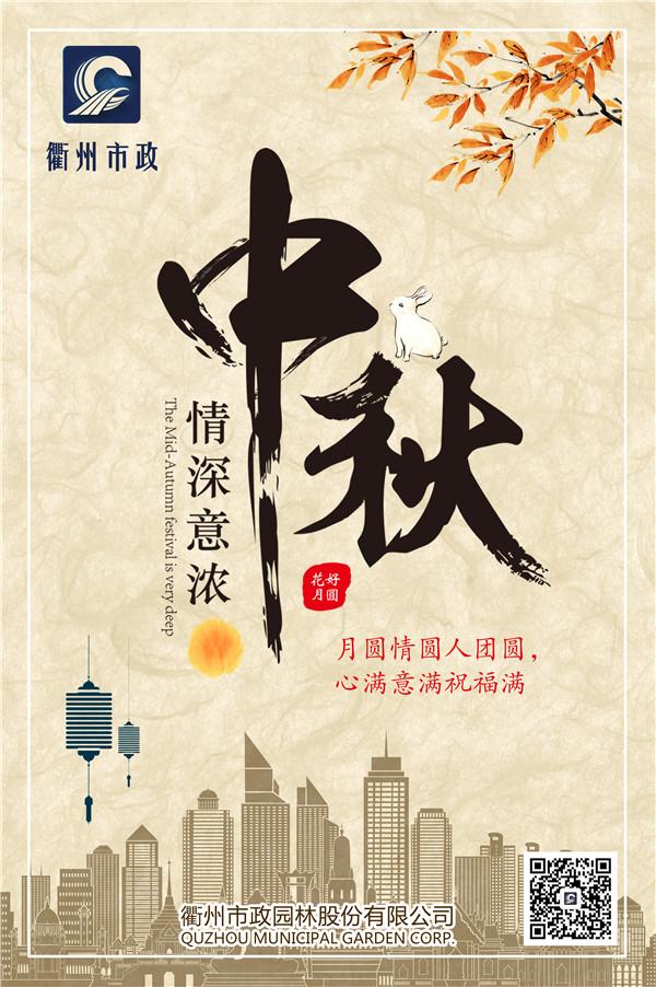 值此中秋佳節(jié)之際,衢州市政園林股份有限公司董事長鄭榮忠攜公司全體員工敬祝各界朋友們:中秋快樂,闔家幸福;生活美滿,萬事如意!