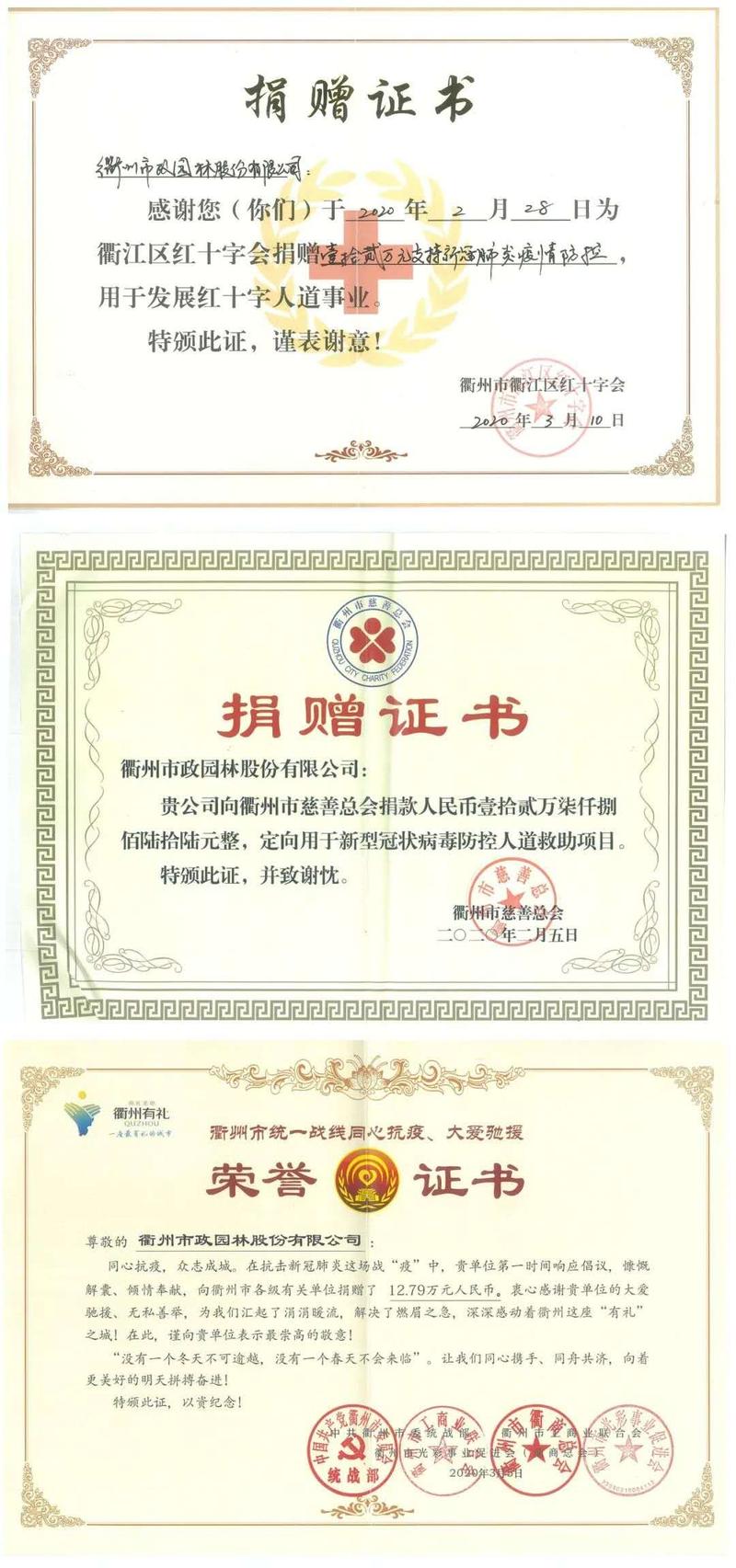 期間,公司積極發(fā)揮企業(yè)擔(dān)當(dāng),2月4日率先向衢州市慈善總會(huì)捐款捐物用于抗擊新冠疫情。隨后又多次向商會(huì)、紅十字會(huì)、鎮(zhèn)政府等抗疫一線部門捐贈(zèng)抗疫急需的物品物資,先后捐款捐物30余萬(wàn)元。