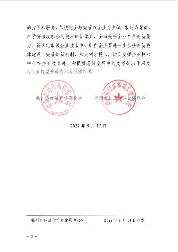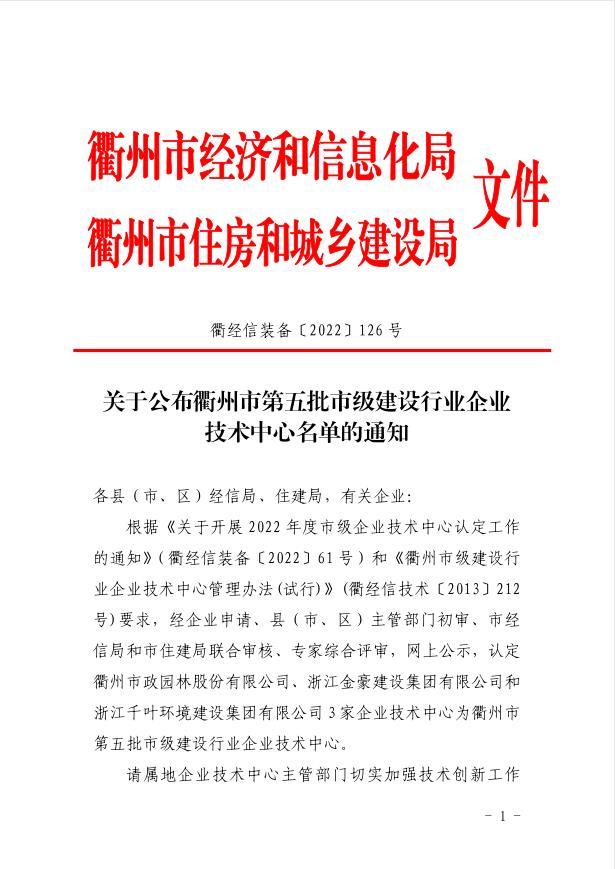 經(jīng)我司申請、縣(市、區(qū))主管部門初審、市經(jīng)信局和市住建局聯(lián)合審核及專家綜合評審,認(rèn)定我司為衢州市第五批市級建設(shè)行業(yè)企業(yè)技術(shù)中心。