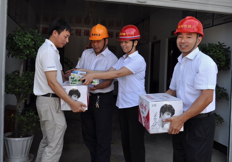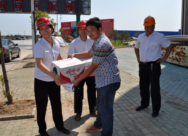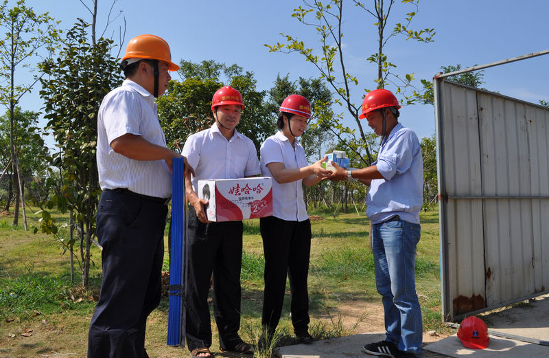 連日高溫酷暑,給在炎炎烈日下作業(yè)的工地工人和管理人員造成嚴(yán)重的困擾,對(duì)各在建項(xiàng)目的安全生產(chǎn)形勢(shì)帶來(lái)嚴(yán)竣挑戰(zhàn)。公司除及時(shí)通知各項(xiàng)目部落實(shí)高溫作業(yè)時(shí)間和防暑降溫措施外,在7月31日由總經(jīng)理助理方小仙、工程部經(jīng)理張金海帶領(lǐng)工程部管理人員對(duì)市區(qū)所有在建項(xiàng)目進(jìn)行高溫慰問(wèn)。