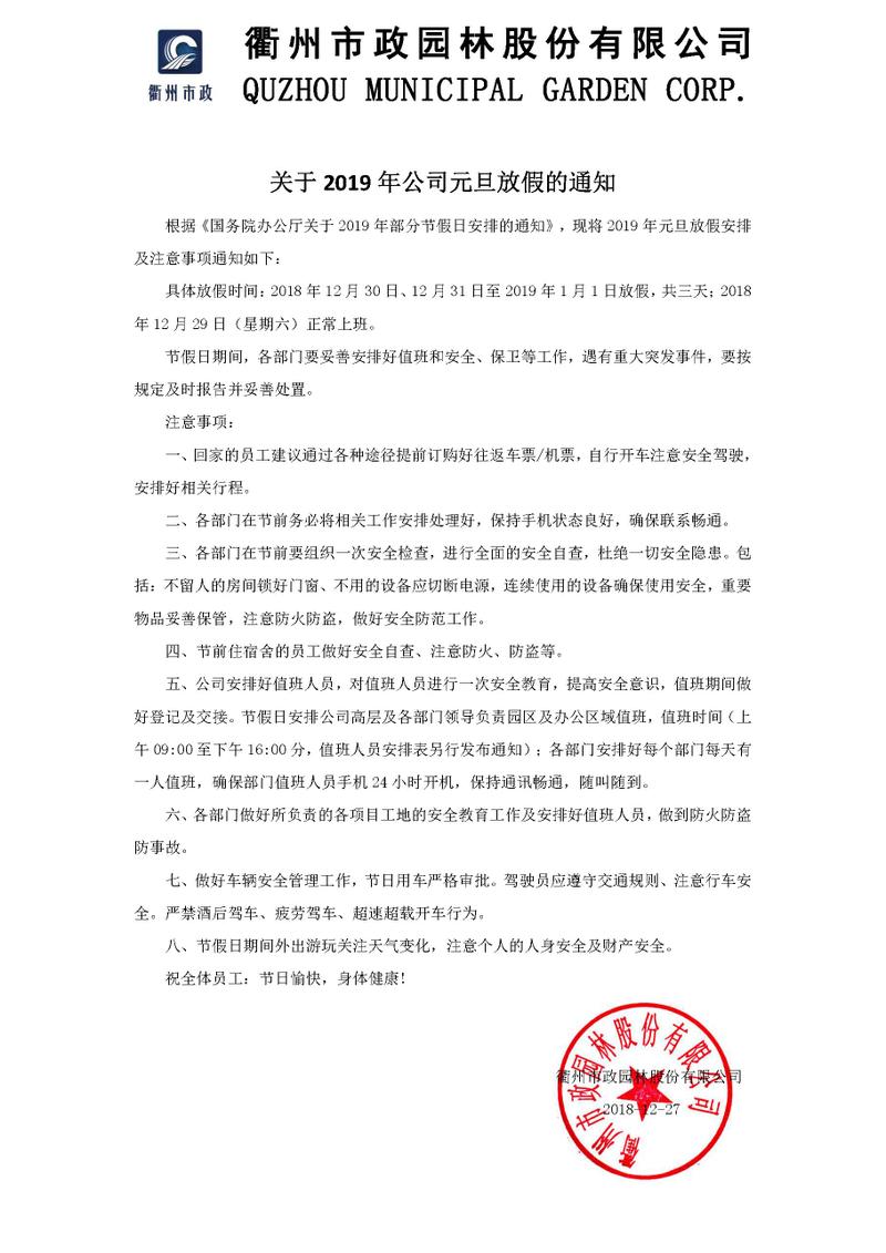 關(guān)于2019年公司元旦放假的通知